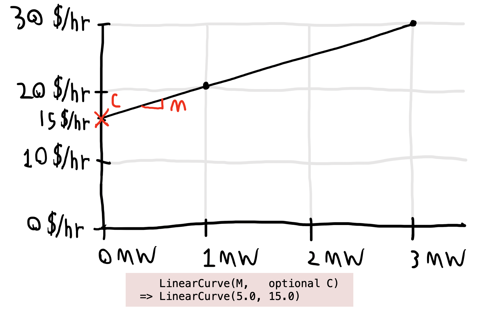 Linear input-output curve with potentially nonzero no-load cost (constant marginal rate) | LinearCurve(5.0, 15.0) | $5/MWh + $15/hr |