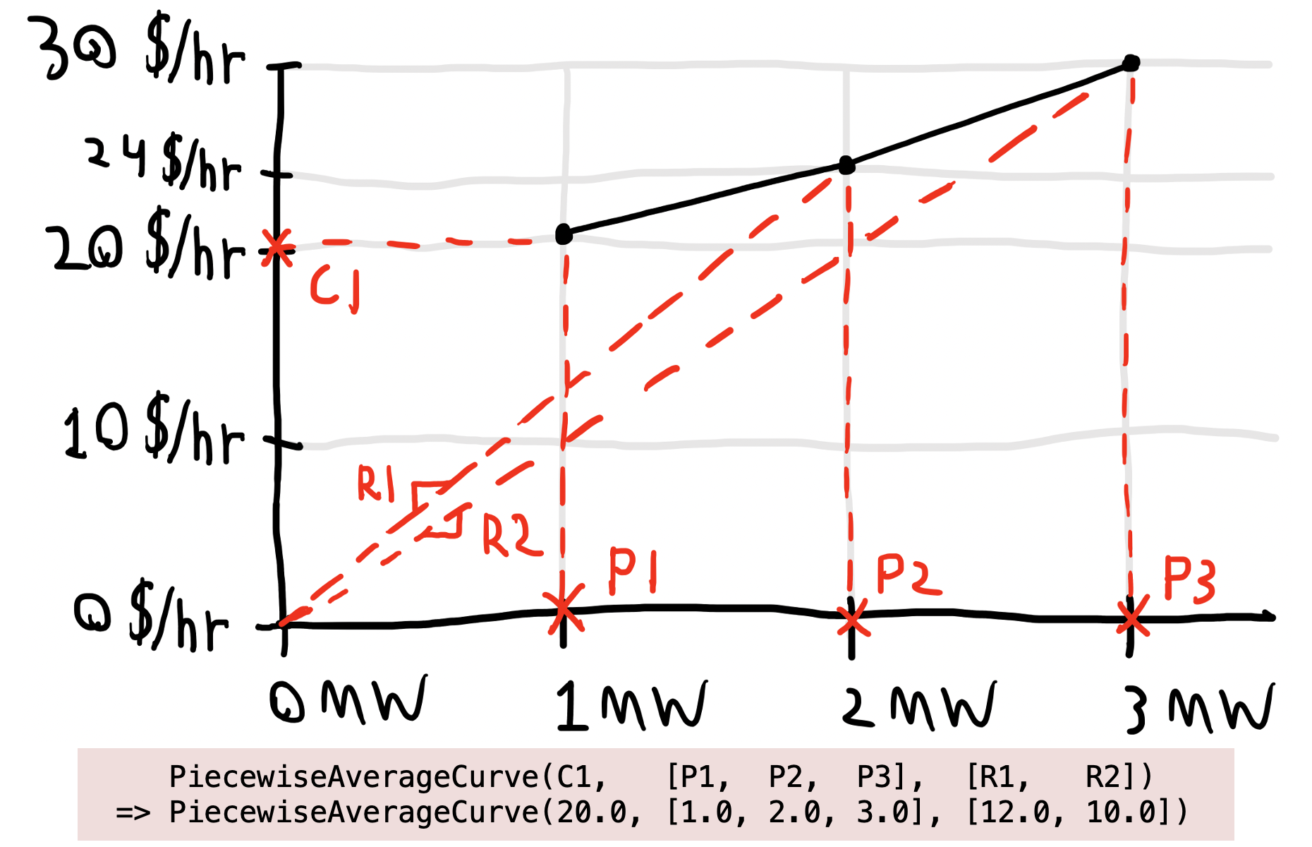 Piecewise linear curve specified by initial value and average rates between production points | PiecewiseAverageCurve(20.0, [1.0, 2.0, 3.0], [12.0, 10.0]) | $20/hr @ 1 MW, $12/MWh @ 2 MW, $10/MWh @ 3 MW, linear $/hr interpolation between these points |