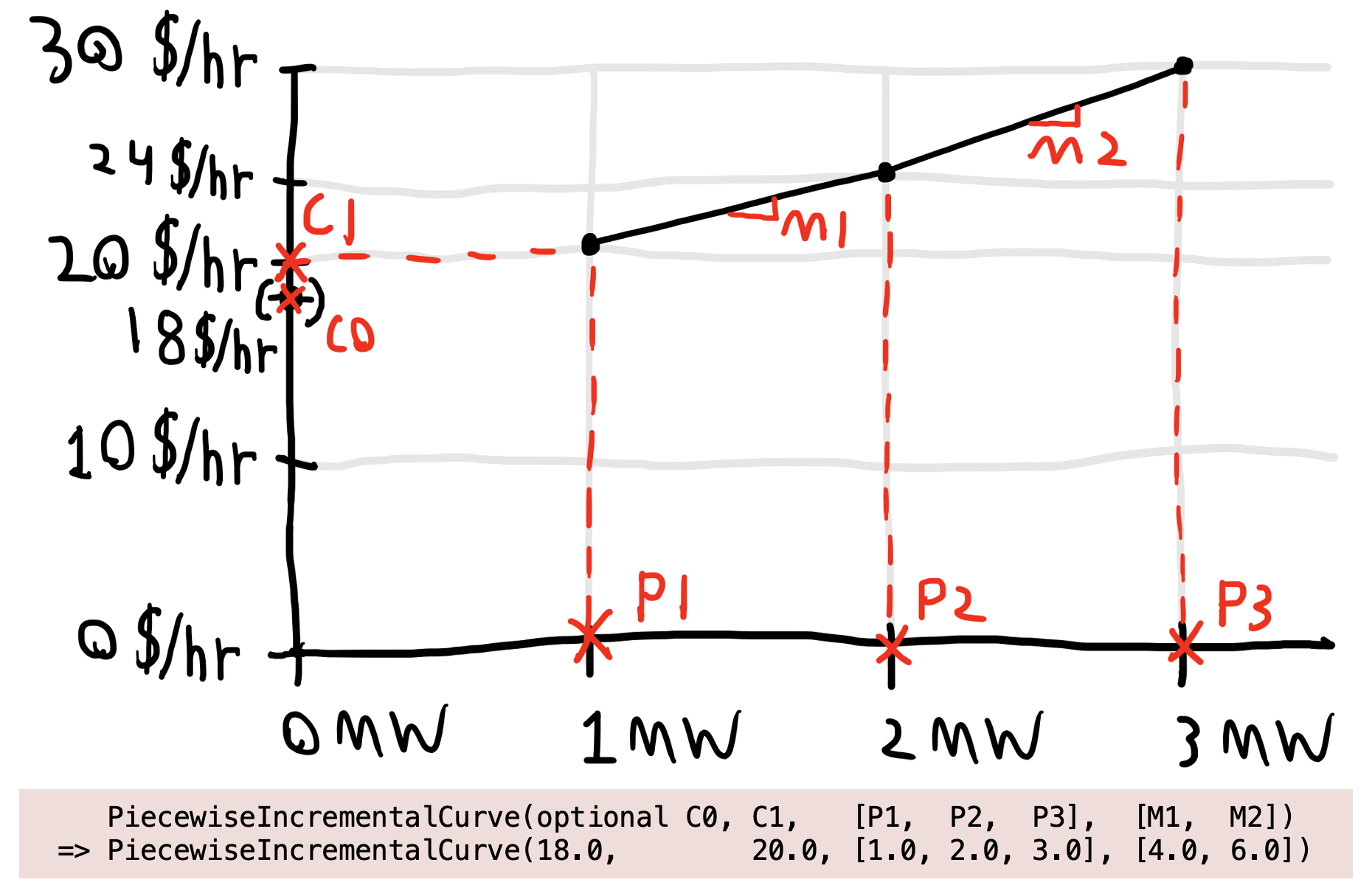 No-load cost plus piecewise linear curve specified by initial value and marginal rates (slopes) between production points | PiecewiseIncrementalCurve(18.0, 20.0, [1.0, 2.0, 3.0], [4.0, 6.0]) | $18/hr no-load cost; $20/hr @ 1 MW plus additional $4/MWh from 1 MW to 2 MW plus additional $6/MWh from 2 MW to 3 MW |