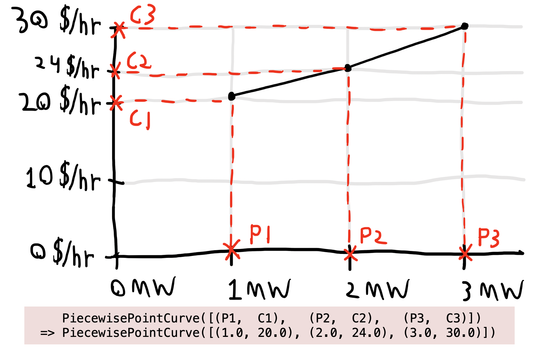 Piecewise linear curve specified by cost values at production points | PiecewisePointCurve([(1.0, 20.0), (2.0, 24.0), (3.0, 30.0)]) | $20/hr @ 1 MW, $24/hr @ 2 MW, $30/hr @ 3 MW, linear $/hr interpolation between these points |