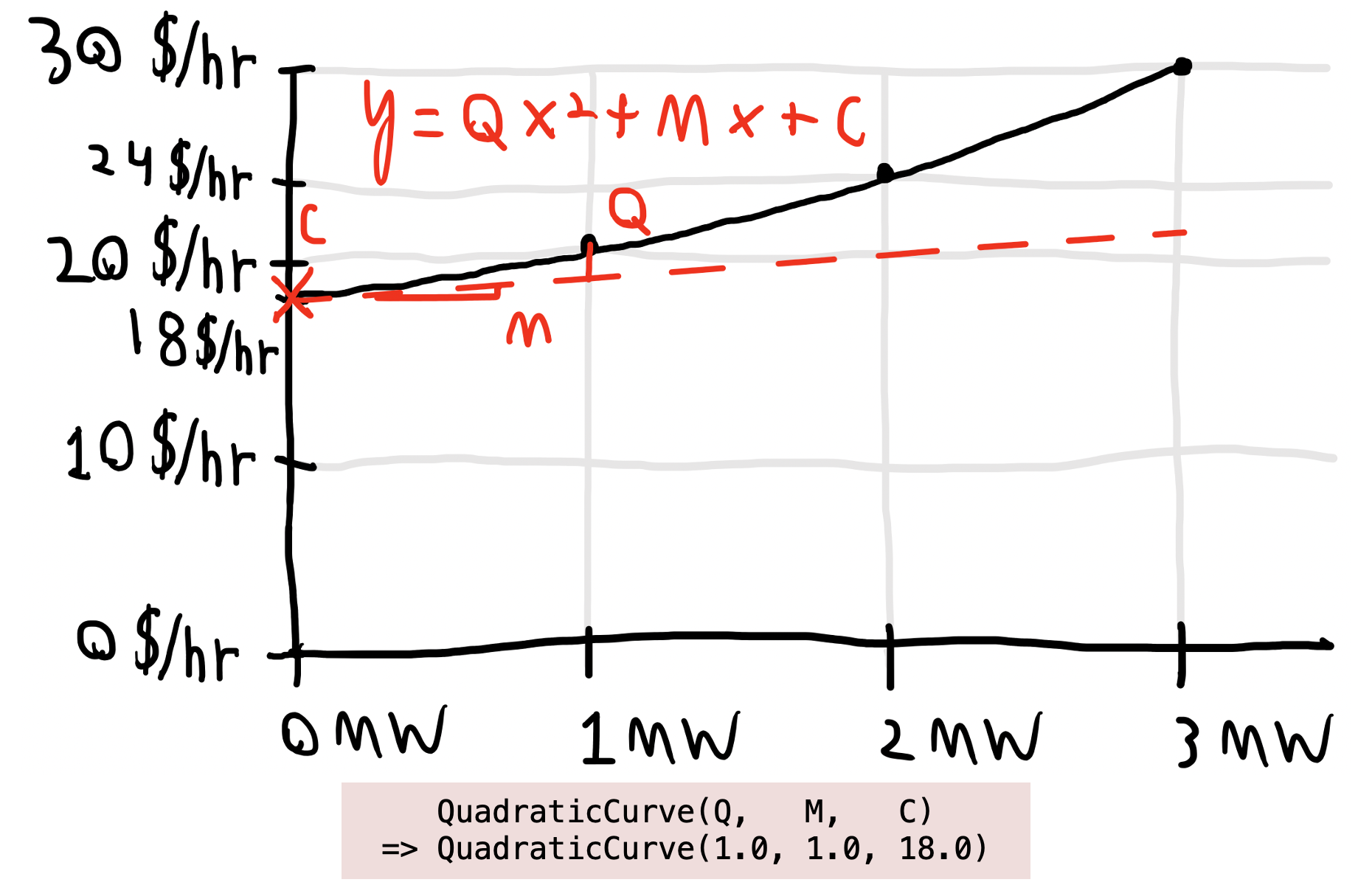 Quadratic input-output curve with potentially nonzero no-load cost | QuadraticCurve(1.0, 1.0, 18.0) | $C(P) = 1 P^2 + 1 P + 18$ where $C$ is $/hr, $P$ is MW |