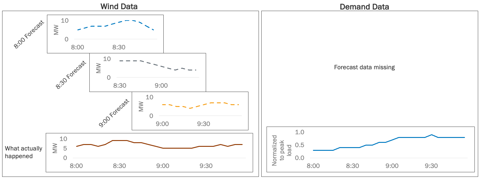 For the wind generator, we have the historical point (deterministic) forecasts of power output. The forecasts were generated every 30 minutes with a 5-minute resolution and 1-hour horizon. We also have measurements what actually happened at 5-minute resolution over the 2 hours.